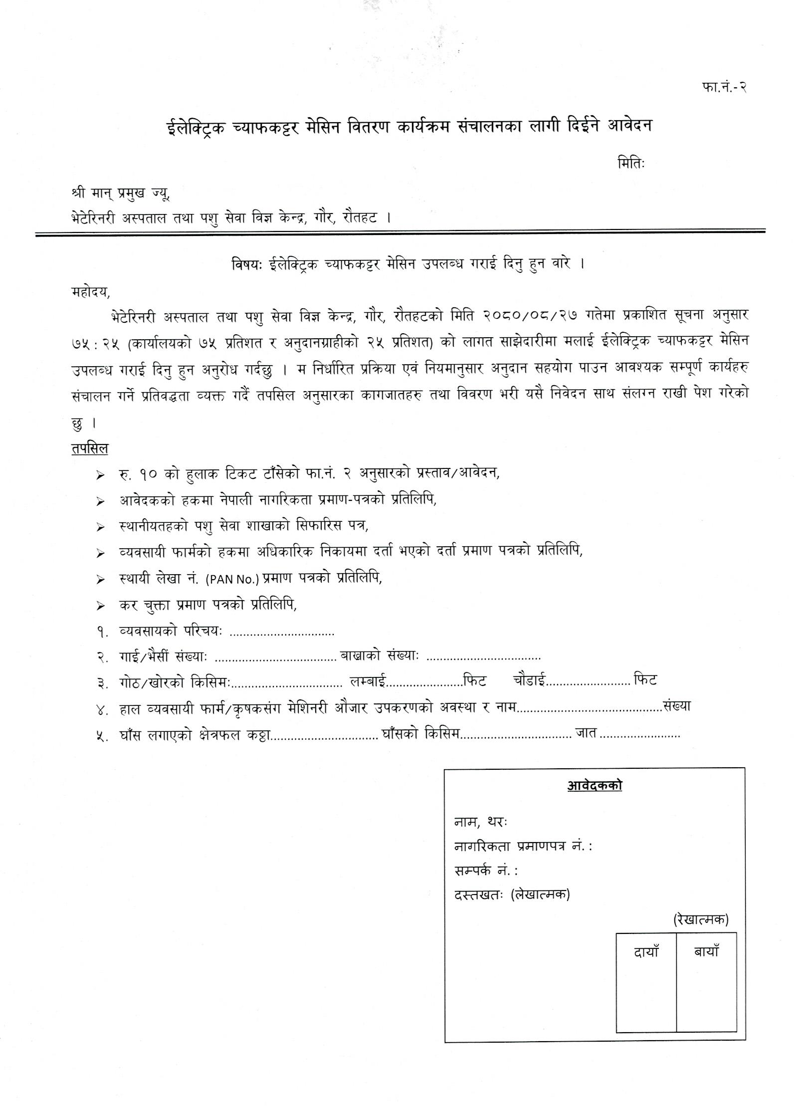 | 8 | ईलेक्ट्रिक च्याफकट्टर फा.नं.-2 | फारम | 2080-08-27 | View | Download |